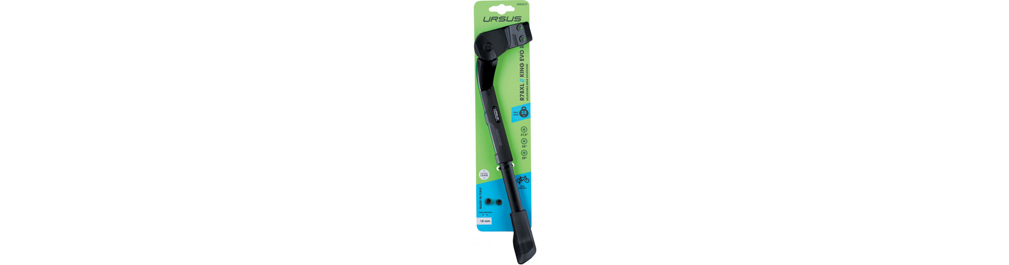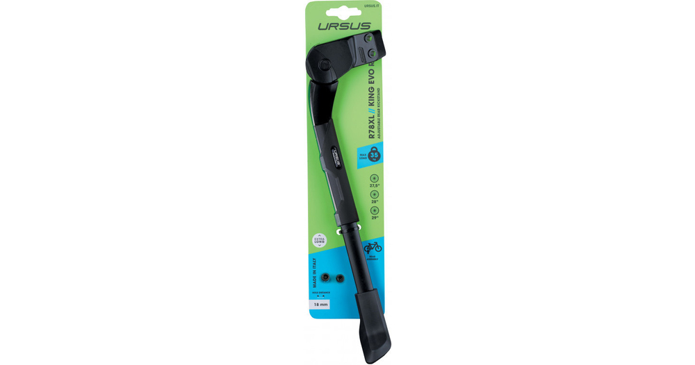 La béquille latérale King EVO de la marque URSUS possède une tête conçue pour être montée sur la base arrière du vélo en entraxe 18 ou 40mm (espace entre les deux trous de fixation).