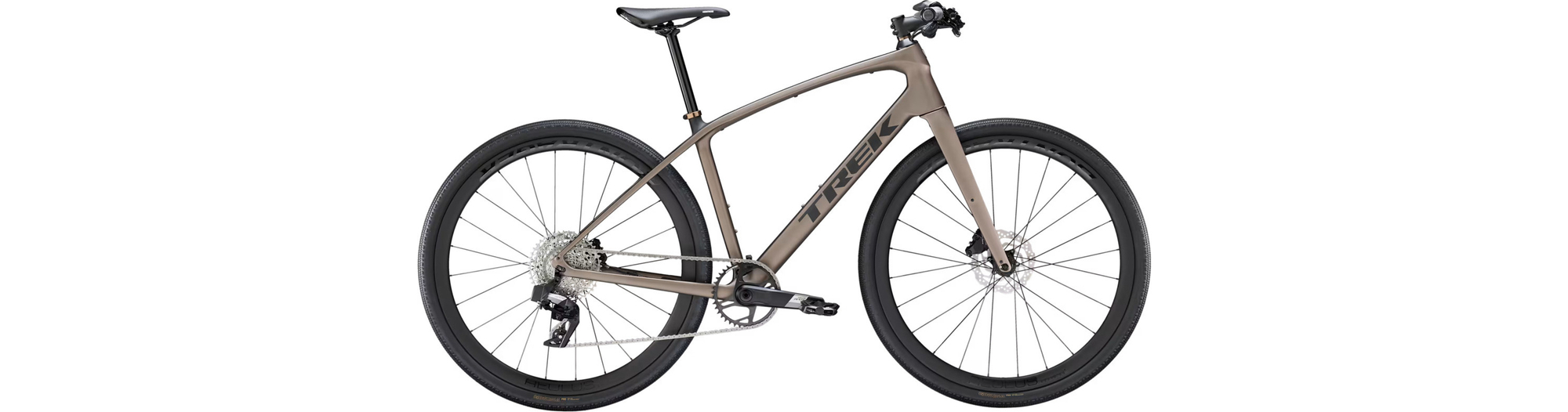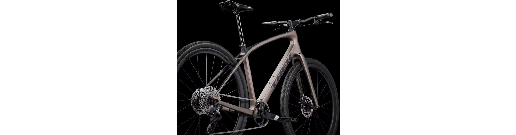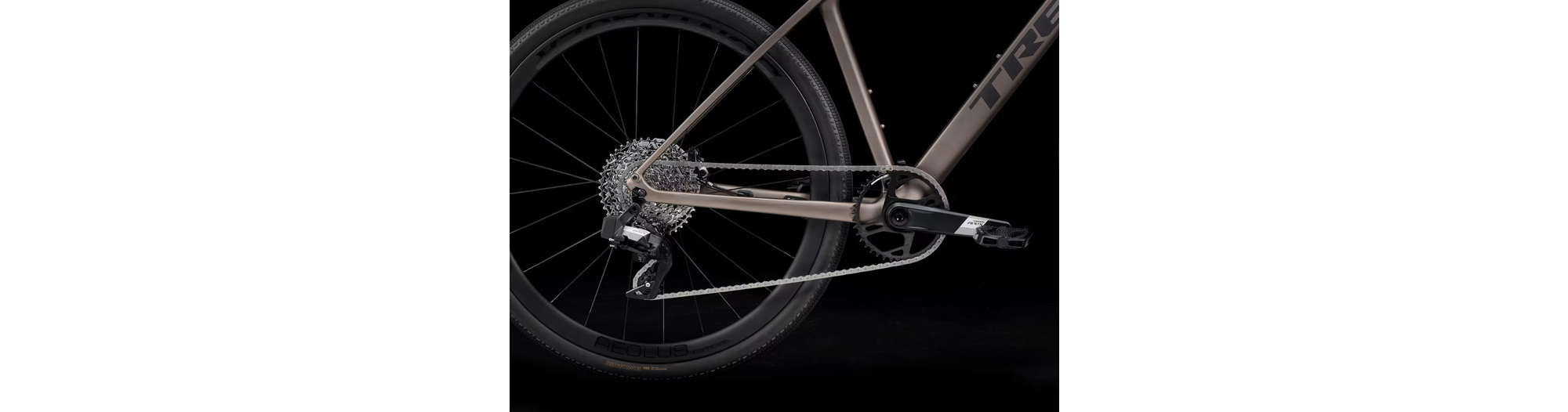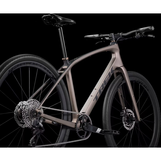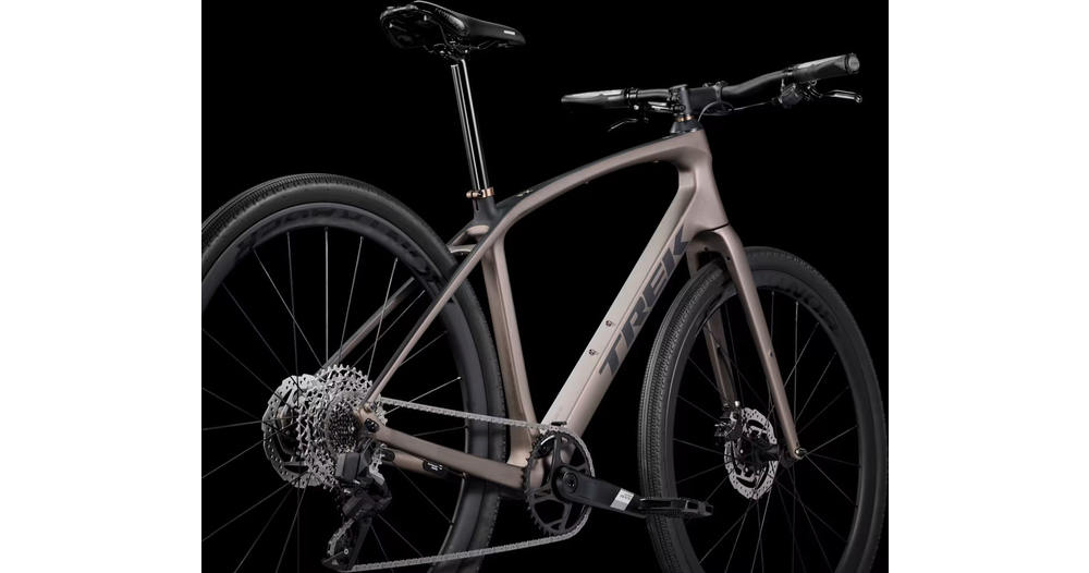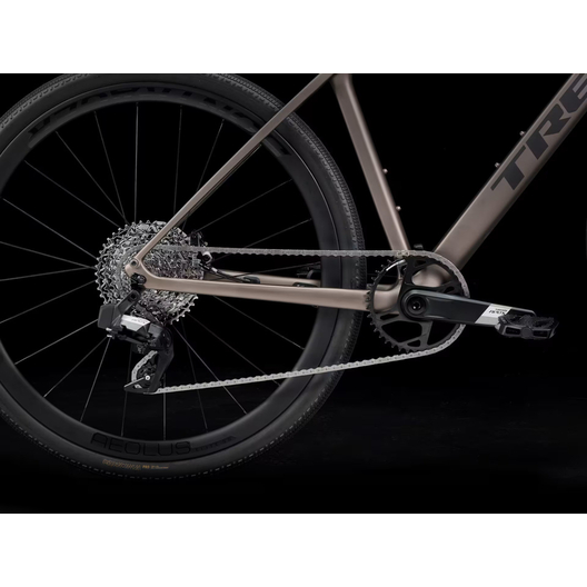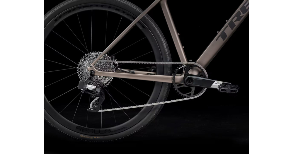 Un cadre léger en OCLV Carbon Série 400 avec fourche en carbone, une transmission 12 vitesses électronique sans fil SRAM Apex XPLR AXS à large plage de rapports, des freins à disque hydrauliques, des fixations masquées pour garde-boue, une paire de roues légères Bontrager Aeolus Elite 35 en carbone avec pneus de gravel Bontrager GR1 Team Issue Tubeless Ready de haute qualité, et un cintre qui absorbe les vibrations avec des poignées ergonomiques.