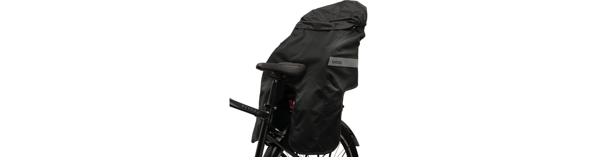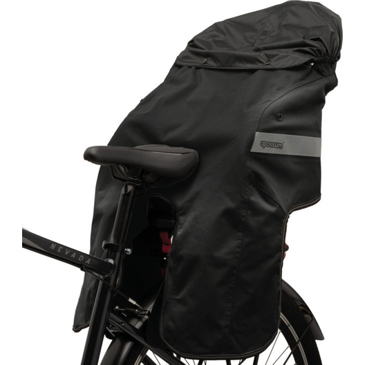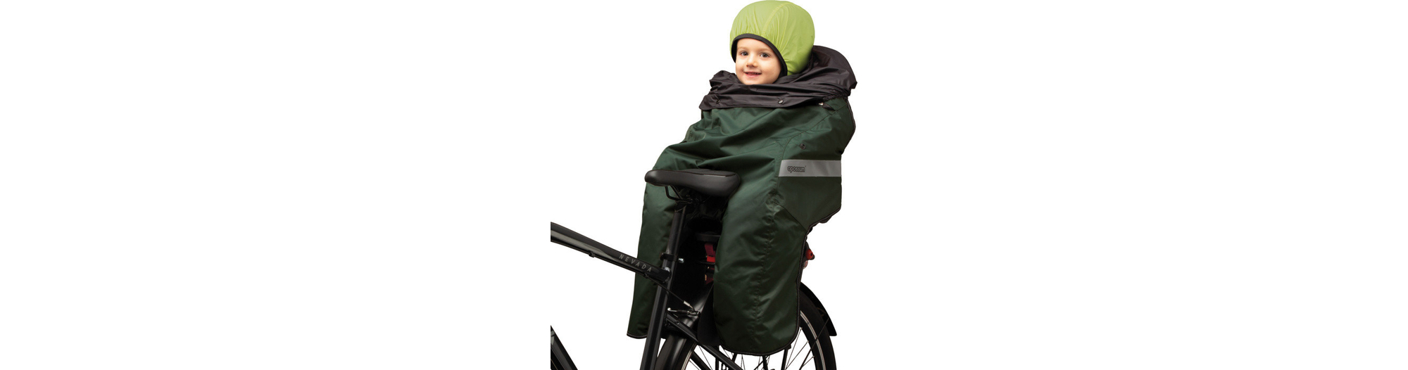 Cape de pluie pour enfant rangée dans la poche avant et pouvant être aussi utilisée comme protection contre la pluie pour le siège enfant.