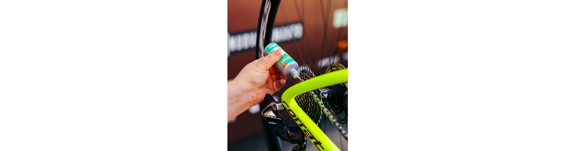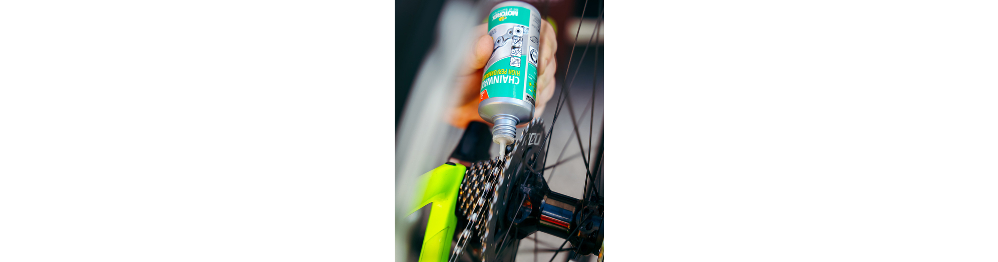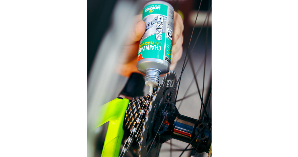 Selon la devise « Aussi peu que possible, autant que nécessaire ». Appliquer MOTOREX CHAINWAX en faisant une rotation complète de la chaîne à l’intérieur et à l’extérieur, et laisser agir quelques minutes. Pour trouver le début et la fin, il peut être très utile de prendre le verrou de chaîne comme repère le cas échéant. Pour permettre au lubrifiant de déployer tous ses effets et de sécher de manière optimale, il ne faut pas utiliser l’entraînement pendant plusieurs heures. L’idéal est de laisser le lubrifiant pour chaînes à base de cire agir pendant la nuit.