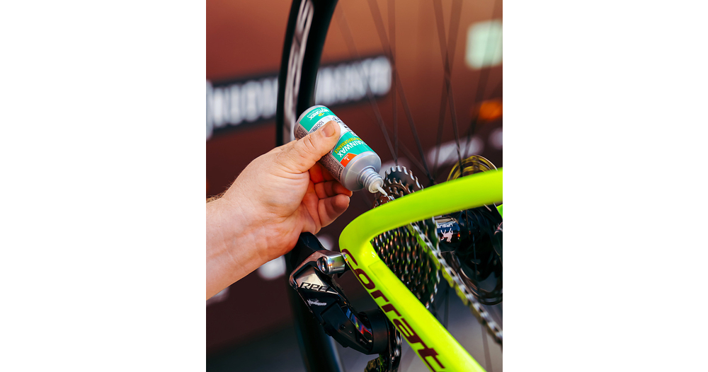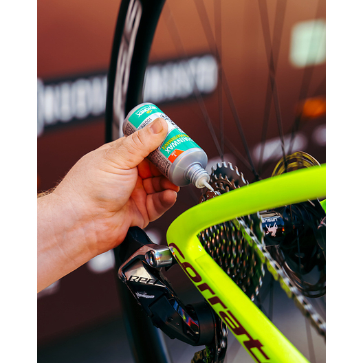 Avant la première application, le système d’entraînement (cassette, chaîne, dérailleur, pignon) doit être totalement exempt de graisse et être sec. Il faut aussi absolument nettoyer minutieusement les chaînes neuves avec du MOTOREX BIKE CHAIN DEGREASER. Toujours bien secouer MOTOREX CHAINWAX avant l’utilisation. Appliquer ensuite sur la chaîne sèche à l’intérieur et à l’extérieur. Température d’utilisation supérieure à 5 °C dans l’idéal. La chaîne peut ensuite être relubrifiée plusieurs fois sans autre nettoyage.