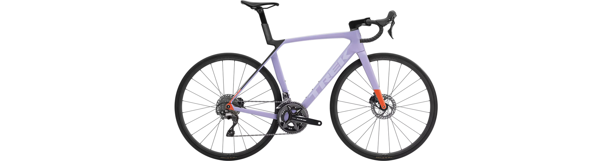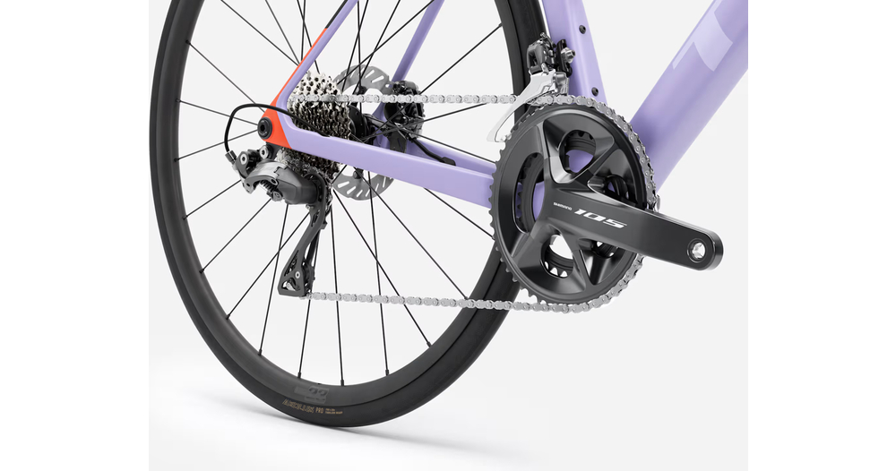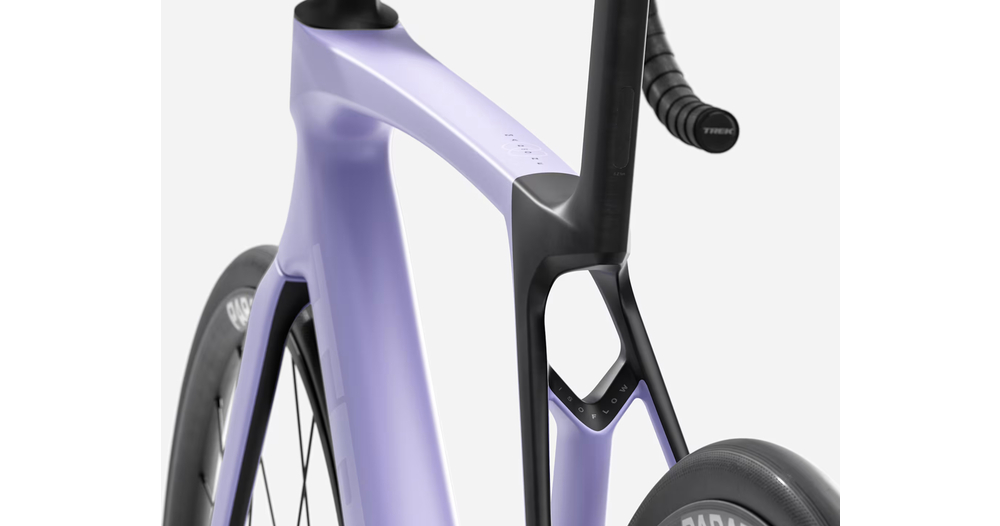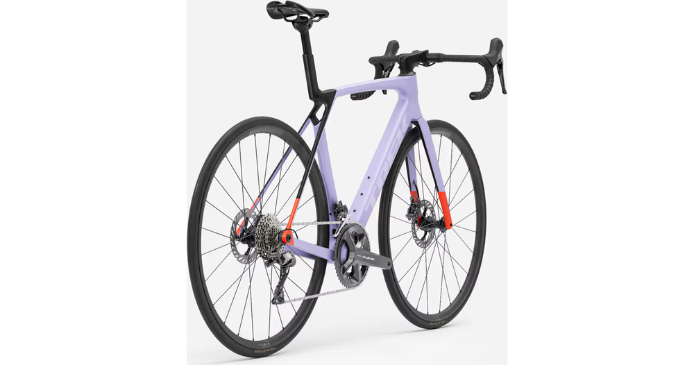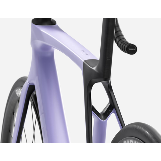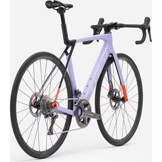 - Madone 8e gén. tout en carbone, douille de direction conique carbone, acheminement interne des câbles de frein, freins à disque à fixation Flat-Mount, axes traversants cannelés de 12x100 mm