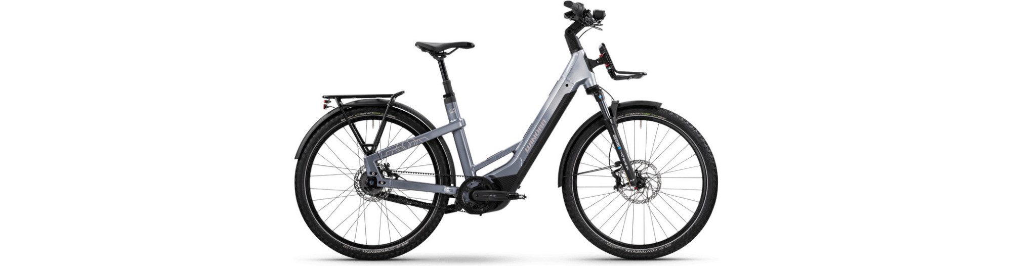Notre nouveau WINORA Yakun R5 Pro allie les sensations d’un SUV au confort et à l’efficacité. C’est le vélo électrique de trekking parfait pour les aventuriers. Surpuissant, le moteur Bosch Performance CX au couple de 85 Nm vous donne un solide coup de pouce quand vous emportez du matériel de camping ou que vous faites les courses de la semaine. D’un poids total autorisé de 150 kg, équipé d’une batterie surdimensionnée de 800 Wh, de gros pneus de 27" d’une largeur de 60 mm et d’un panier avant standard, vous êtes parfaitement équipé pour aller n’importe où sur deux roues. Avec la courroie d’entraînement peu exigeante en entretien, le moyeu à vitesses intégrées, les freins Shimano XT et une fourche à suspension pneumatique Suntour, chaque parcours est une expérience en soi, en ville comme hors piste.