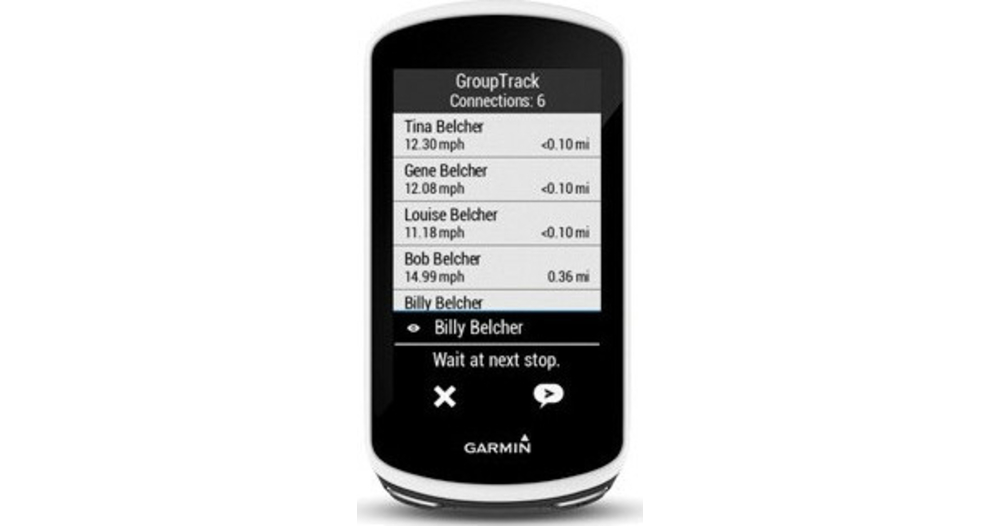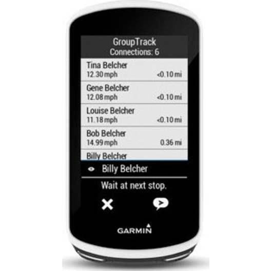 Plus besoin d'attraper votre téléphone ou de vous faire du souci pour les cyclistes qui se sont détachés du peloton. La fonction d'envoi de messages entre cyclistes vous permet d'envoyer des messages prérédigés depuis votre Edge 1030 sur leur compteur Edge. Vous pouvez ainsi demander à vos amis de vous attendre quelques minutes ou de partir sans vous. Si vous avez crevé ou que vous avez besoin d'aide, vous pouvez envoyer un message à vos compagnons de route via GroupTrack, pour qu'ils puissent vous retrouver.