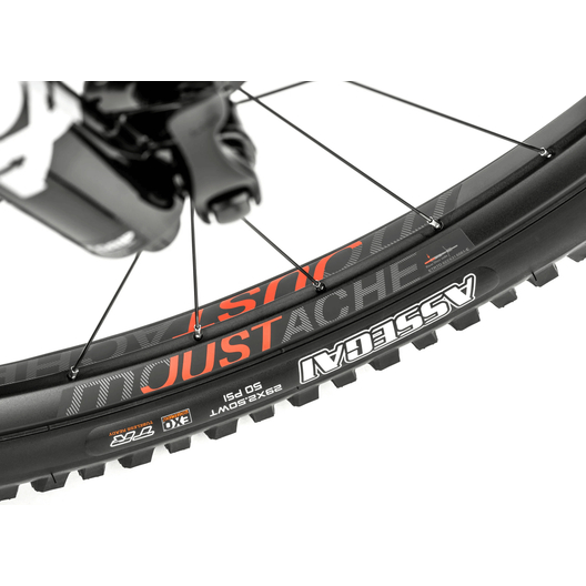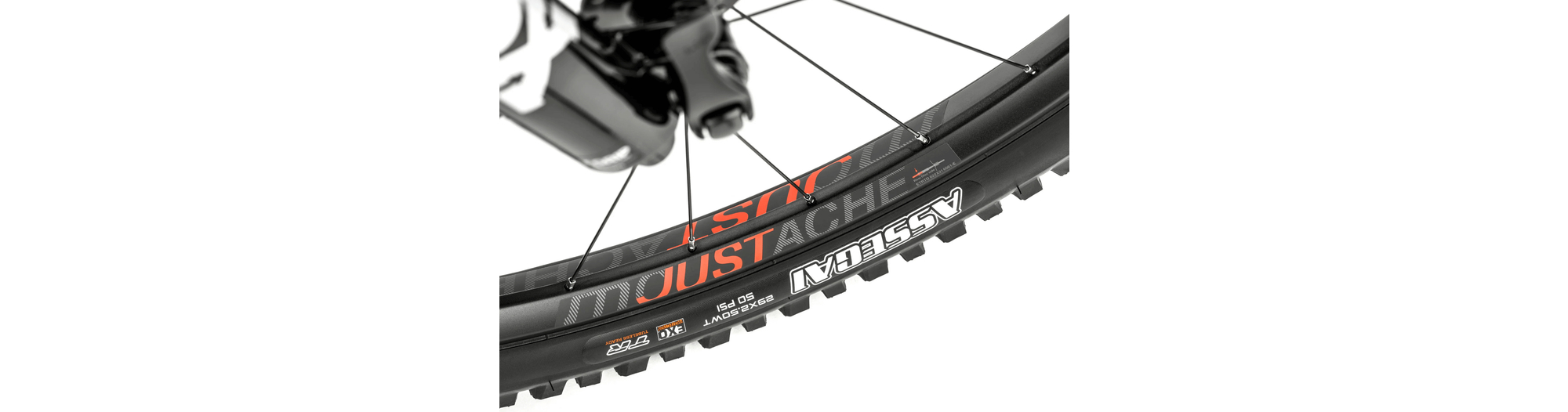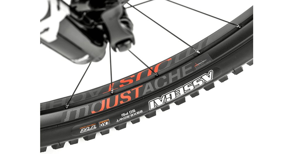 - Développées par les ingénieurs de Moustache et assemblées entièrement en France, les roues sont montées avec des jantes 29" asymétriques Moustache Just_Carbon en carbone Toray T700S. La largeur interne de 31mm est optimisée pour la monte des pneus Maxxis Assegai 3C MaxxTerra 29x2.50 apportant une grande surface de contact pour une adhérence accrue à tout moment.